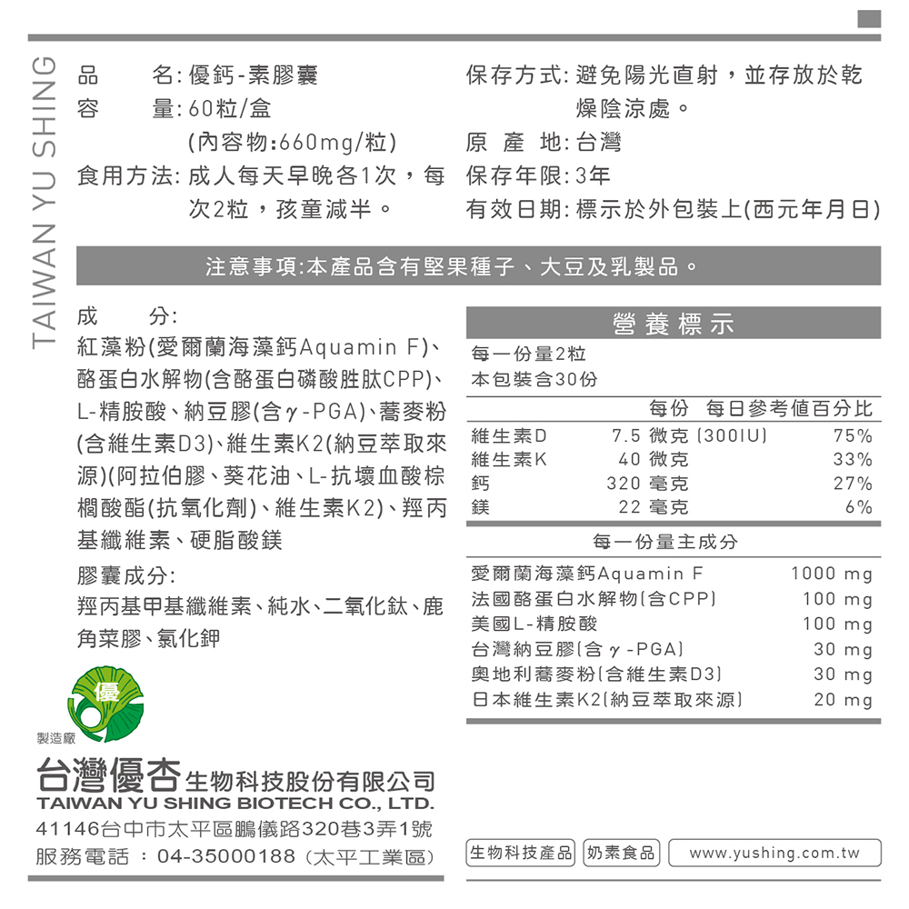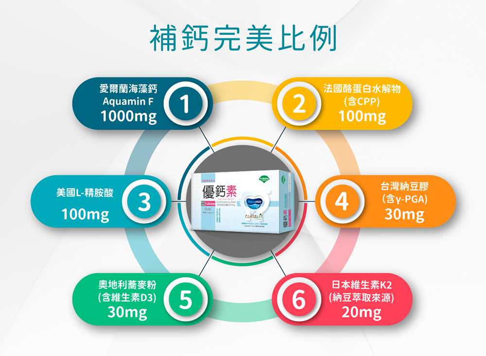 - 紅藻粉(愛爾蘭海藻鈣Aquamin F)、酪蛋白水解物(含酪蛋白磷酸胜肽CPP)、L-精胺酸、納豆膠(含γ-PGA)、蕎麥粉(含維生素D3)、納豆菌發酵粉(含維生素K2)(α-環狀糊精、納豆菌發酵粉)、羥丙基纖維素、硬脂酸鎂