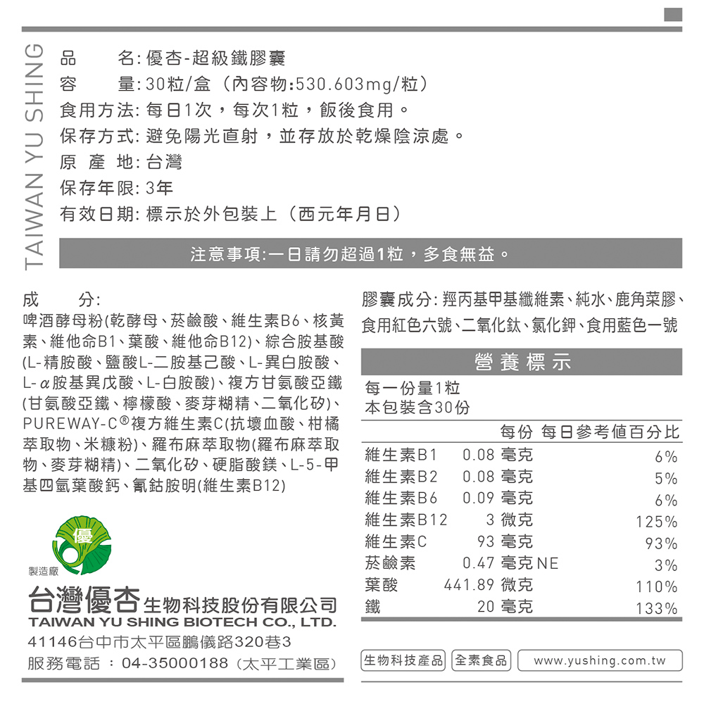 啤酒酵母粉(乾酵母、菸鹼酸、維生素B6、核黃素、維他命B1、葉酸、維他命B12)、綜合胺基酸(L-精胺酸、鹽酸L-二胺基己酸、L-異白胺酸、L-α胺基異戊酸、L-白胺酸)、複方甘氨酸亞鐵(甘氨酸亞鐵、檸檬酸、麥芽糊精、二氧化矽)、PUREWAY C