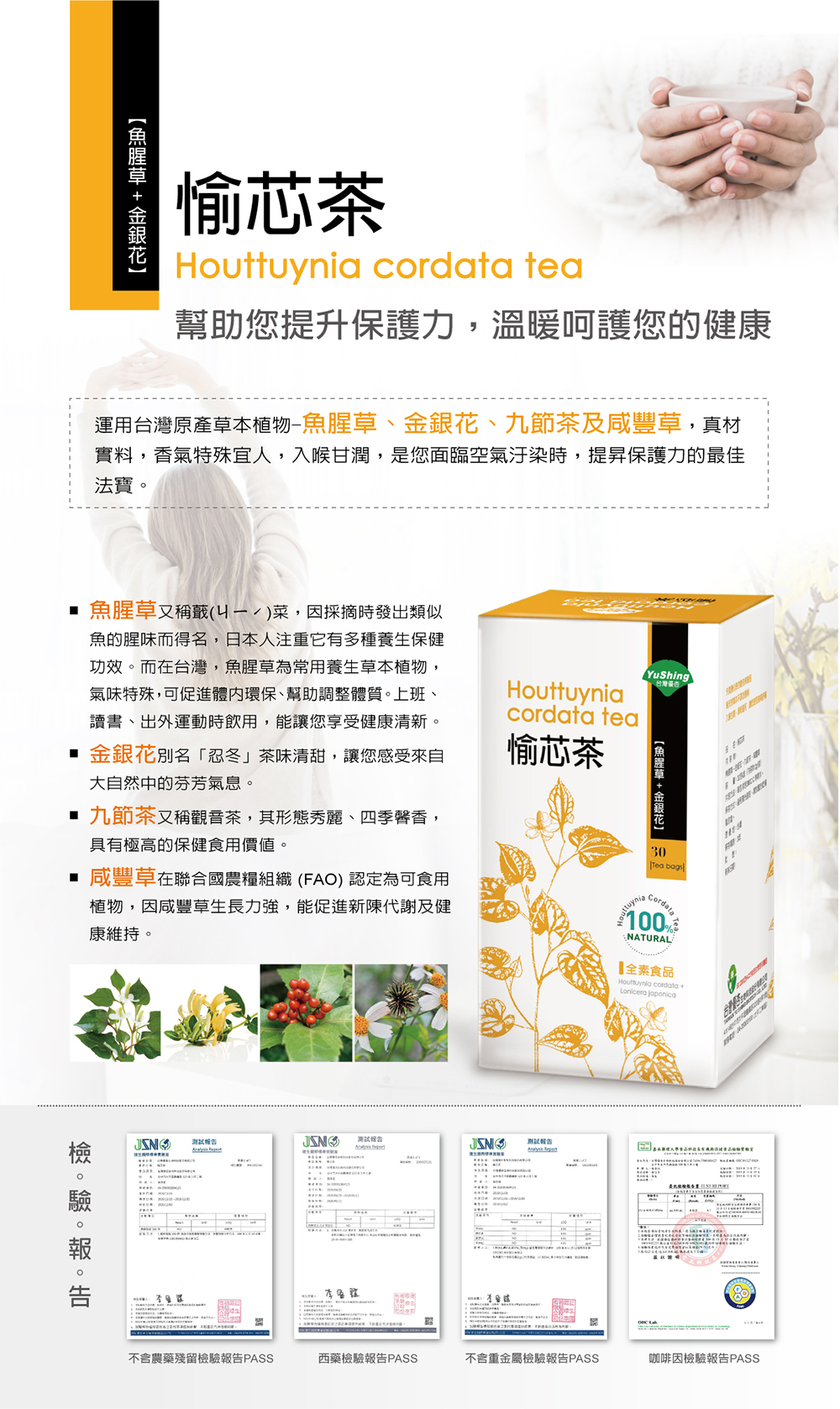 魚腥草又稱蕺(ㄐㄧˊ)菜,因採摘時發出類似魚的腥味而得名,日本人注重它有多種養生保健功效。而在台灣,魚腥草為常用養生草本植物,氣味特殊,可促進體內環保、幫助調整體質。上班、讀書、出外運動時飲用,能讓您享受健康清新。