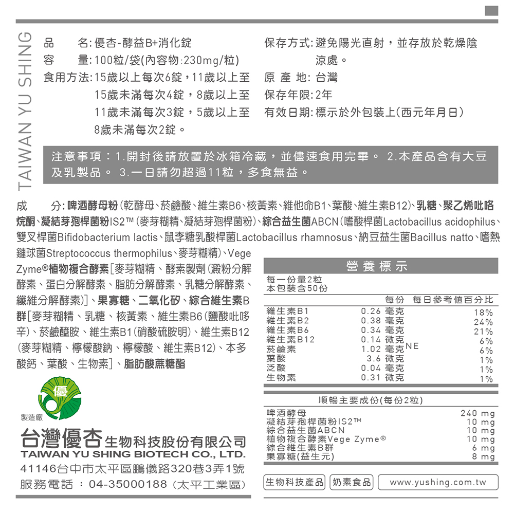 - 啤酒酵母(乾酵母、菸鹼酸、維生素B6、核黃素、維他命B1、葉酸 、維生素B12)、聚乙烯吡咯烷酮、凝結芽孢桿菌粉IS2™(麥芽糊精、凝結芽孢桿菌粉、綜合益生菌ABCE芝(嗜酸桿菌Lactobacillus acidophilus、雙叉桿菌Bifidobacterium lactis、鼠李糖乳酸桿菌Lactobcillus rhamnosus、納豆益生菌Bacillus natto、嗜熱鏈球菌Streptococcus thermophilus、麥芽糊精)、VegeZyme®、植物複合酵素〔麥芽糊精、酵素製劑(澱粉分解酵素、蛋白分解酵素、脂肪分解酵素、乳糖分解酵素、纖維分解酵素)〕、果寡糖、二氧化矽、綜合維生素B群〔麥芽糊精、乳糖、核黃素、維生素B6、鹽酸吡哆辛、菸鹼醯胺、維生素B1(硝酸硫胺明)、維生素B12(麥芽糊精、檸檬酸鈉、檸檬酸、維生素B12)、本多酸鈣、葉酸、生物素〕、脂肪酸蔗糖酯